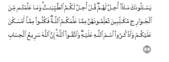 4. Yas-aloonaka matha ohilla lahum qul ohilla lakumu alttayyibatu wama AAallamtum mina aljawarihi mukallibeena tuAAallimoonahunna mimma AAallamakumu Allahu fakuloo mimma amsakna AAalaykum waothkuroo isma Allahi AAalayhi waittaqoo Allaha inna Allaha sareeAAu alhisabi