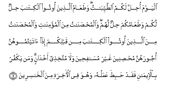 5. Alyawma ohilla lakumu alttayyibatu wataAAamu allatheena ootoo alkitaba hillun lakum wataAAamukum hillun lahum waalmuhsanatu mina almu/minati waalmuhsanatu mina allatheena ootoo alkitaba min qablikum itha ataytumoohunna ojoorahunna muhsineena ghayra musafiheena wala muttakhithee akhdanin waman yakfur bial-eemani faqad habita AAamaluhu wahuwa fee al-akhirati mina alkhasireena
