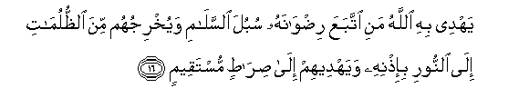 16. Yahdee bihi Allahu mani ittabaAAa ridwanahu subula alssalami wayukhrijuhum mina alththulumati ila alnnoori bi-ithnihi wayahdeehim ila siratin mustaqeemin