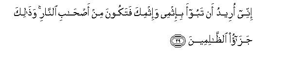 29. Innee oreedu an taboo-a bi-ithmee wa-ithmika fatakoona min as-habi alnnari wathalika jazao alththalimeena