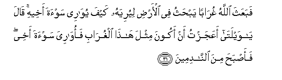 31. FabaAAatha Allahu ghuraban yabhathu fee al-ardi liyuriyahu kayfa yuwaree saw-ata akheehi qala ya waylata aAAajaztu an akoona mithla hatha alghurabi faowariya saw-ata akhee faasbaha mina alnnadimeena