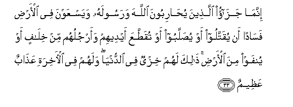 33. Innama jazao allatheena yuhariboona Allaha warasoolahu wayasAAawna fee al-ardi fasadan an yuqattaloo aw yusallaboo aw tuqattaAAa aydeehim waarjuluhum min khilafin aw yunfaw mina al-ardi thalika lahum khizyun fee alddunya walahum fee al-akhirati AAathabun AAatheemun