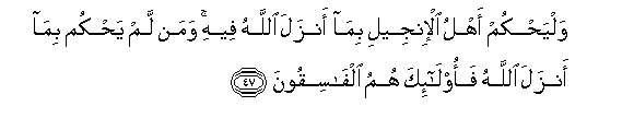 47. Walyahkum ahlu al-injeeli bima anzala Allahu feehi waman lam yahkum bima anzala Allahu faola-ika humu alfasiqoona