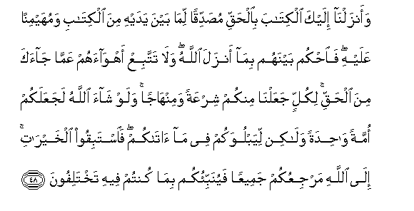 48. Waanzalna ilayka alkitaba bialhaqqi musaddiqan lima bayna yadayhi mina alkitabi wamuhayminan AAalayhi faohkum baynahum bima anzala Allahu wala tattabiAA ahwaahum AAamma jaaka mina alhaqqi likullin jaAAalna minkum shirAAatan waminhajan walaw shaa Allahu lajaAAalakum ommatan wahidatan walakin liyabluwakum feema atakum faistabiqoo alkhayrati ila Allahi marjiAAukum jameeAAan fayunabbi-okum bima kuntum feehi takhtalifoona