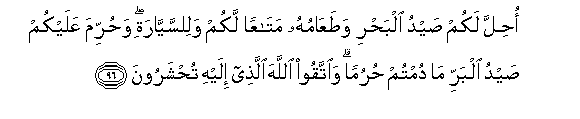 96. Ohilla lakum saydu albahri wataAAamuhu mataAAan lakum walilssayyarati wahurrima AAalaykum saydu albarri ma dumtum huruman waittaqoo Allaha allathee ilayhi tuhsharoona