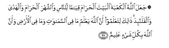 97. JaAAala Allahu alkaAAbata albayta alharama qiyaman lilnnasi waalshshahra alharama waalhadya waalqala-ida thalika litaAAlamoo anna Allaha yaAAlamu ma fee alssamawati wama fee al-ardi waanna Allaha bikulli shay-in AAaleemun