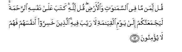 12. Qul liman ma fee alssamawati waal-ardi qul lillahi kataba AAala nafsihi alrrahmata layajmaAAannakum ila yawmi alqiyamati la rayba feehi allatheena khasiroo anfusahum fahum la yu/minoona