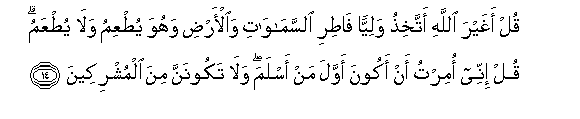 14. Qul aghayra Allahi attakhithu waliyyan fatiri alssamawati waal-ardi wahuwa yutAAimu wala yutAAamu qul innee omirtu an akoona awwala man aslama wala takoonanna mina almushrikeena