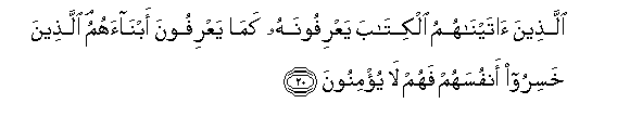 20. Allatheena ataynahumu alkitaba yaAArifoonahu kama yaAArifoona abnaahum allatheena khasiroo anfusahum fahum la yu/minoona