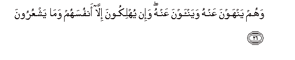 26. Wahum yanhawna AAanhu wayan-awna AAanhu wa-in yuhlikoona illa anfusahum wama yashAAuroona