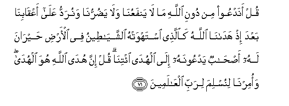 71. Qul anadAAoo min dooni Allahi ma la yanfaAAuna wala yadurruna wanuraddu AAala aAAqabina baAAda ith hadana Allahu kaallathee istahwat-hu alshshayateenu fee al-ardi hayrana lahu as-habun yadAAoonahu ila alhuda i/tina qul inna huda Allahi huwa alhuda waomirna linuslima lirabbi alAAalameena