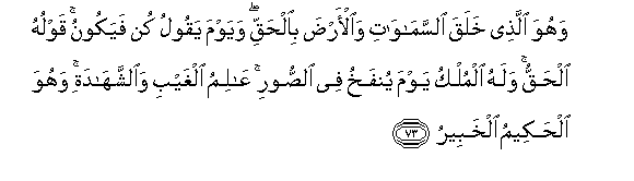 73. Wahuwa allathee khalaqa alssamawati waal-arda bialhaqqi wayawma yaqoolu kun fayakoonu qawluhu alhaqqu walahu almulku yawma yunfakhu fee alssoori AAalimu alghaybi waalshshahadati wahuwa alhakeemu alkhabeeru