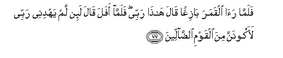 77. Falamma raa alqamara bazighan qala hatha rabbee falamma afala qala la-in lam yahdinee rabbee laakoonanna mina alqawmi alddalleena
