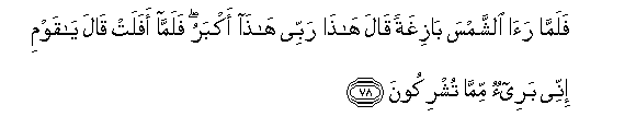 78. Falamma raa alshshamsa bazighatan qala hatha rabbee hatha akbaru falamma afalat qala ya qawmi innee baree-on mimma tushrikoona