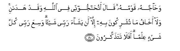 80. Wahajjahu qawmuhu qala atuhajjoonnee fee Allahi waqad hadani wala akhafu ma tushrikoona bihi illa an yashaa rabbee shay-an wasiAAa rabbee kulla shay-in AAilman afala tatathakkaroona