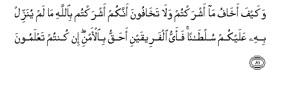 81. Wakayfa akhafu ma ashraktum wala takhafoona annakum ashraktum biAllahi ma lam yunazzil bihi AAalaykum sultanan faayyu alfareeqayni ahaqqu bial-amni in kuntum taAAlamoona