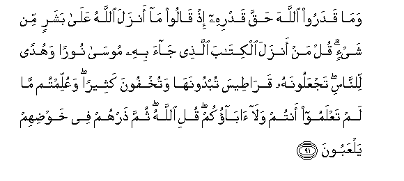 91. Wama qadaroo Allaha haqqa qadrihi ith qaloo ma anzala Allahu AAala basharin min shay-in qul man anzala alkitaba allathee jaa bihi moosa nooran wahudan lilnnasi tajAAaloonahu qarateesa tubdoonaha watukhfoona katheeran waAAullimtum ma lam taAAlamoo antum wala abaokum quli Allahu thumma tharhum fee khawdihim yalAAaboona