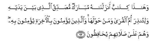 92. Wahatha kitabun anzalnahu mubarakun musaddiqu allathee bayna yadayhi walitunthira omma alqura waman hawlaha waallatheena yu/minoona bial-akhirati yu/minoona bihi wahum AAala salatihim yuhafithoona