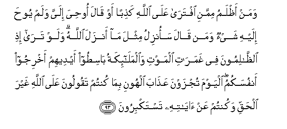 93. Waman athlamu mimmani iftara AAala Allahi kathiban aw qala oohiya ilayya walam yooha ilayhi shay-on waman qala saonzilu mithla ma anzala Allahu walaw tara ithi alththalimoona fee ghamarati almawti waalmala-ikatu basitoo aydeehim akhrijoo anfusakumu alyawma tujzawna AAathaba alhooni bima kuntum taqooloona AAala Allahi ghayra alhaqqi wakuntum AAan ayatihi tastakbiroona