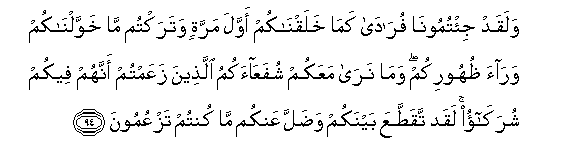 94. Walaqad ji/tumoona furada kama khalaqnakum awwala marratin wataraktum ma khawwalnakum waraa thuhoorikum wama nara maAAakum shufaAAaakumu allatheena zaAAamtum annahum feekum shurakao laqad taqattaAAa baynakum wadalla AAankum ma kuntum tazAAumoona