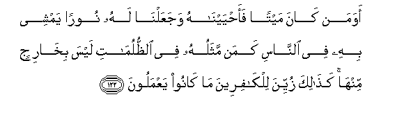 122. Awa man kana maytan faahyaynahu wajaAAalna lahu nooran yamshee bihi fee alnnasi kaman mathaluhu fee alththulumati laysa bikharijin minha kathalika zuyyina lilkafireena ma kanoo yaAAmaloona
