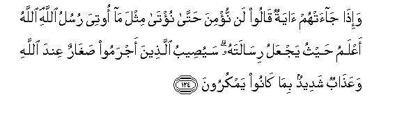 124. Wa-itha jaat-hum ayatun qaloo lan nu/mina hatta nu/ta mithla ma ootiya rusulu Allahi Allahu aAAlamu haythu yajAAalu risalatahu sayuseebu allatheena ajramoo sagharun AAinda Allahi waAAathabun shadeedun bima kanoo yamkuroona