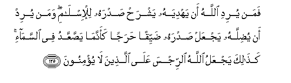 125. Faman yuridi Allahu an yahdiyahu yashrah sadrahu lil-islami waman yurid an yudillahu yajAAal sadrahu dayyiqan harajan kaannama yassaAAAAadu fee alssama-i kathalika yajAAalu Allahu alrrijsa AAala allatheena la yu/minoona
