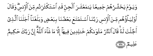 128. Wayawma yahshuruhum jameeAAan ya maAAshara aljinni qadi istakthartum mina al-insi waqala awliyaohum mina al-insi rabbana istamtaAAa baAAduna bibaAAdin wabalaghna ajalana allathee ajjalta lana qala alnnaru mathwakum khalideena feeha illa ma shaa Allahu inna rabbaka hakeemun AAaleemun