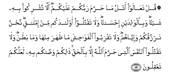 151. Qul taAAalaw atlu ma harrama rabbukum AAalaykum alla tushrikoo bihi shay-an wabialwalidayni ihsanan wala taqtuloo awladakum min imlaqin nahnu narzuqukum wa-iyyahum wala taqraboo alfawahisha ma thahara minha wama batana wala taqtuloo alnnafsa allatee harrama Allahu illa bialhaqqi thalikum wassakum bihi laAAallakum taAAqiloona