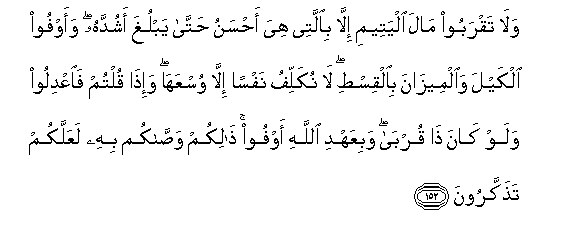 152. Wala taqraboo mala alyateemi illa biallatee hiya ahsanu hatta yablugha ashuddahu waawfoo alkayla waalmeezana bialqisti la nukallifu nafsan illa wusAAaha wa-itha qultum faiAAdiloo walaw kana tha qurba wabiAAahdi Allahi awfoo thalikum wassakum bihi laAAallakum tathakkaroona