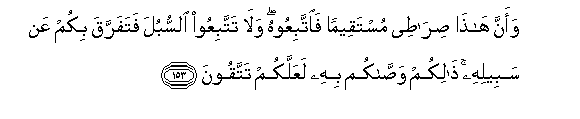 153. Waanna hatha siratee mustaqeeman faittabiAAoohu wala tattabiAAoo alssubula fatafarraqa bikum AAan sabeelihi thalikum wassakum bihi laAAallakum tattaqoona