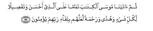 154. Thumma atayna moosa alkitaba tamaman AAala allathee ahsana watafseelan likulli shay-in wahudan warahmatan laAAallahum biliqa-i rabbihim yu/minoona