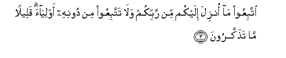 3. IttabiAAoo ma onzila ilaykum min rabbikum wala tattabiAAoo min doonihi awliyaa qaleelan ma tathakkaroona