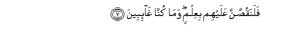7. Falanaqussanna AAalayhim biAAilmin wama kunna gha-ibeena