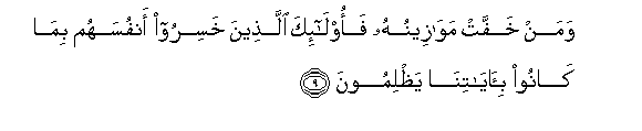 9. Waman khaffat mawazeenuhu faola-ika allatheena khasiroo anfusahum bima kanoo bi-ayatina yathlimoona