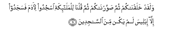 11. Walaqad khalaqnakum thumma sawwarnakum thumma qulna lilmala-ikati osjudoo li-adama fasajadoo illa ibleesa lam yakun mina alssajideena