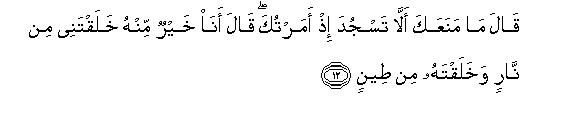 12. Qala ma manaAAaka alla tasjuda ith amartuka qala ana khayrun minhu khalaqtanee min narin wakhalaqtahu min teenin