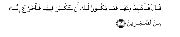 13. Qala faihbit minha fama yakoonu laka an tatakabbara feeha faokhruj innaka mina alssaghireena