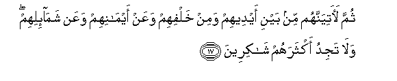 17. Thumma laatiyannahum min bayni aydeehim wamin khalfihim waAAan aymanihim waAAan shama-ilihim wala tajidu aktharahum shakireena