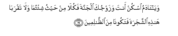 19. Waya adamu oskun anta wazawjuka aljannata fakula min haythu shi/tuma wala taqraba hathihi alshshajarata fatakoona mina alththalimeena