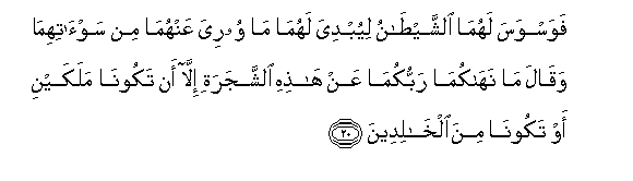 20. Fawaswasa lahuma alshshaytanu liyubdiya lahuma ma wooriya AAanhuma min saw-atihima waqala ma nahakuma rabbukuma AAan hathihi alshshajarati illa an takoona malakayni aw takoona mina alkhalideena
