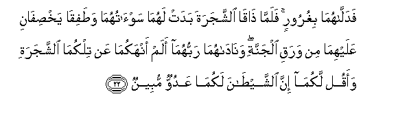 22. Fadallahuma bighuroorin falamma thaqa alshshajarata badat lahuma saw-atuhuma watafiqa yakhsifani AAalayhima min waraqi aljannati wanadahuma rabbuhuma alam anhakuma AAan tilkuma alshshajarati waaqul lakuma inna alshshaytana lakuma AAaduwwun mubeenun