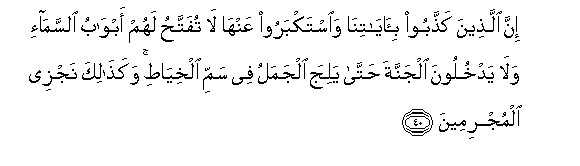 40. Inna allatheena kaththaboo bi-ayatina waistakbaroo AAanha la tufattahu lahum abwabu alssama-i wala yadkhuloona aljannata hatta yalija aljamalu fee sammi alkhiyati wakathalika najzee almujrimeena