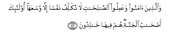 42. Waallatheena amanoo waAAamiloo alssalihati la nukallifu nafsan illa wusAAaha ola-ika as-habu aljannati hum feeha khalidoona
