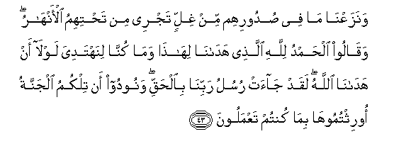 43. WanazaAAna ma fee sudoorihim min ghillin tajree min tahtihimu al-anharu waqaloo alhamdu lillahi allathee hadana lihatha wama kunna linahtadiya lawla an hadana Allahu laqad jaat rusulu rabbina bialhaqqi wanoodoo an tilkumu aljannatu oorithtumooha bima kuntum taAAmaloona