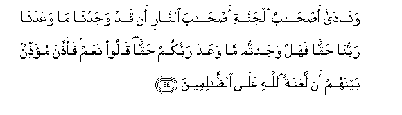 44. Wanada as-habu aljannati as-haba alnnari an qad wajadna ma waAAadana rabbuna haqqan fahal wajadtum ma waAAada rabbukum haqqan qaloo naAAam faaththana mu-aththinun baynahum an laAAnatu Allahi AAala alththalimeena