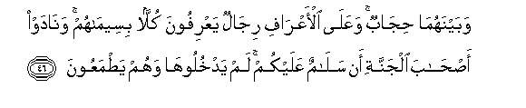 46. Wabaynahuma hijabun waAAala al-aAArafi rijalun yaAArifoona kullan biseemahum wanadaw as-haba aljannati an salamun AAalaykum lam yadkhulooha wahum yatmaAAoona