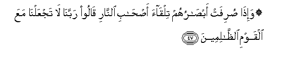 47. Wa-itha surifat absaruhum tilqaa as-habi alnnari qaloo rabbana la tajAAalna maAAa alqawmi alththalimeena