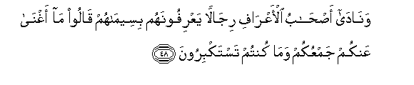 48. Wanada as-habu al-aAArafi rijalan yaAArifoonahum biseemahum qaloo ma aghna AAankum jamAAukum wama kuntum tastakbiroona
