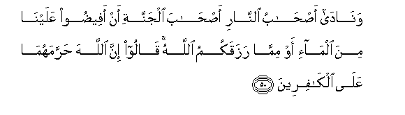 50. Wanada as-habu alnari as-haba aljannati an afeedoo AAalayna mina alma-i aw mimma razaqakumu Allahu qaloo inna Allaha harramahuma AAala alkafireena